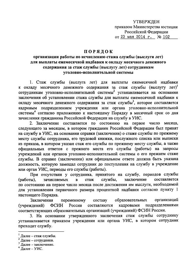 "ОБ УТВЕРЖДЕНИИ ПОРЯДКА ОРГАНИЗАЦИИ РАБОТЫ ПО ИСЧИСЛЕНИЮ СТАЖА СЛУЖБЫ (ВЫСЛУГИ ЛЕТ) ДЛЯ ВЫПЛАТЫ ЕЖЕМЕСЯЧНОЙ НАДБАВКИ К ОКЛАДУ МЕСЯЧНОГО ДЕНЕЖНОГО СОДЕРЖАНИЯ ЗА СТАЖ СЛУЖБЫ (ВЫСЛУГУ ЛЕТ) СОТРУДНИКАМ УГОЛОВНО - ИСПОЛНИТЕЛЬНОЙ СИСТЕМЫ"