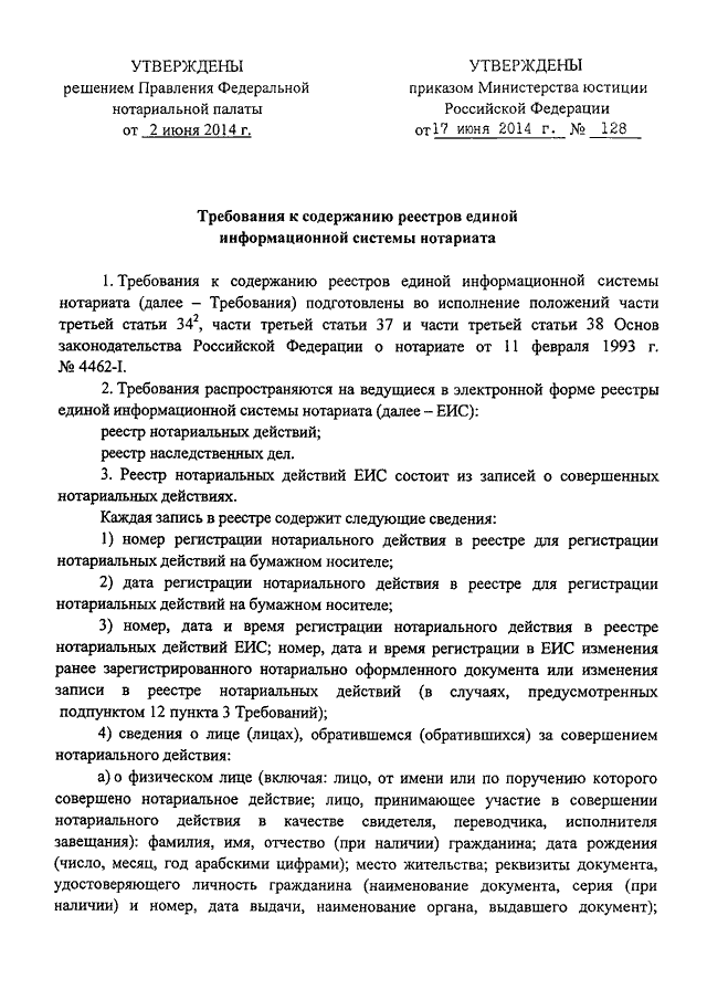 "ОБ УТВЕРЖДЕНИИ ТРЕБОВАНИЙ К СОДЕРЖАНИЮ РЕЕСТРОВ ЕДИНОЙ ИНФОРМАЦИОННОЙ СИСТЕМЫ НОТАРИАТА"