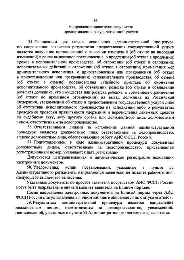 "ОБ УТВЕРЖДЕНИИ АДМИНИСТРАТИВНОГО РЕГЛАМЕНТА ФЕДЕРАЛЬНОЙ СЛУЖБЫ СУДЕБНЫХ ПРИСТАВОВ ПО ПРЕДОСТАВЛЕНИЮ ГОСУДАРСТВЕННОЙ УСЛУГИ ПО РАССМОТРЕНИЮ ЗАЯВЛЕНИЙ В РАМКАХ ИСПОЛНИТЕЛЬНОГО ПРОИЗВОДСТВА ОБ ИСПРАВЛЕНИИ ДОПУЩЕННЫХ В ПОСТАНОВЛЕНИИ СУДЕБНОГО ПРИСТАВА ОПИСОК ИЛИ ЯВНЫХ АРИФМЕТИЧЕСКИХ ОШИБОК, О ПРОДЛЕНИИ СРОКОВ В ИСПОЛНИТЕЛЬНОМ ПРОИЗВОДСТВЕ, ОБ ОТЛОЖЕНИИ ИСПОЛНИТЕЛЬНЫХ ДЕЙСТВИЙ И ОБ ОТЛОЖЕНИИ ПРИМЕНЕНИЯ МЕР ПРИНУДИТЕЛЬНОГО ИСПОЛНЕНИЯ, О ПРИОСТАНОВЛЕНИИ ИЛИ ПРЕКРАЩЕНИИ ИСПОЛНИТЕЛЬНОГО ПРОИЗВОДСТВА, ОБ ОТМЕНЕ ПОСТАНОВЛЕНИЯ СУДЕБНОГО ПРИСТАВА ОБ ОКОНЧАНИИ ИСПОЛНИТЕЛЬНОГО ПРОИЗВОДСТВА, О ПРОВЕДЕНИИ ПРОВЕРКИ ПРАВИЛЬНОСТИ УДЕРЖАНИЯ И ПЕРЕЧИСЛЕНИЯ ДЕНЕЖНЫХ СРЕДСТВ ПО СУДЕБНОМУ АКТУ, АКТУ ДРУГОГО ОРГАНА ИЛИ ДОЛЖНОСТНОГО ЛИЦА, О РОЗЫСКЕ ДОЛЖНИКА, ЕГО ИМУЩЕСТВА ИЛИ РОЗЫСКЕ РЕБЕНКА, О ВРЕМЕННОМ ОГРАНИЧЕНИИ НА ВЫЕЗД ДОЛЖНИКА ИЗ РОССИЙСКОЙ ФЕДЕРАЦИИ"