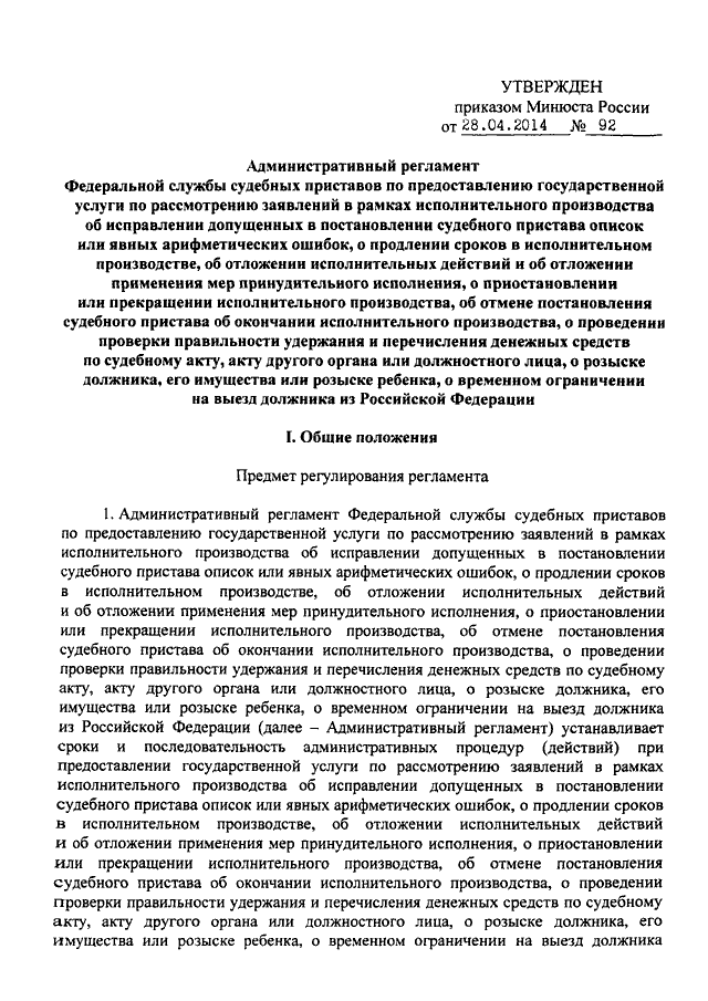 "ОБ УТВЕРЖДЕНИИ АДМИНИСТРАТИВНОГО РЕГЛАМЕНТА ФЕДЕРАЛЬНОЙ СЛУЖБЫ СУДЕБНЫХ ПРИСТАВОВ ПО ПРЕДОСТАВЛЕНИЮ ГОСУДАРСТВЕННОЙ УСЛУГИ ПО РАССМОТРЕНИЮ ЗАЯВЛЕНИЙ В РАМКАХ ИСПОЛНИТЕЛЬНОГО ПРОИЗВОДСТВА ОБ ИСПРАВЛЕНИИ ДОПУЩЕННЫХ В ПОСТАНОВЛЕНИИ СУДЕБНОГО ПРИСТАВА ОПИСОК ИЛИ ЯВНЫХ АРИФМЕТИЧЕСКИХ ОШИБОК, О ПРОДЛЕНИИ СРОКОВ В ИСПОЛНИТЕЛЬНОМ ПРОИЗВОДСТВЕ, ОБ ОТЛОЖЕНИИ ИСПОЛНИТЕЛЬНЫХ ДЕЙСТВИЙ И ОБ ОТЛОЖЕНИИ ПРИМЕНЕНИЯ МЕР ПРИНУДИТЕЛЬНОГО ИСПОЛНЕНИЯ, О ПРИОСТАНОВЛЕНИИ ИЛИ ПРЕКРАЩЕНИИ ИСПОЛНИТЕЛЬНОГО ПРОИЗВОДСТВА, ОБ ОТМЕНЕ ПОСТАНОВЛЕНИЯ СУДЕБНОГО ПРИСТАВА ОБ ОКОНЧАНИИ ИСПОЛНИТЕЛЬНОГО ПРОИЗВОДСТВА, О ПРОВЕДЕНИИ ПРОВЕРКИ ПРАВИЛЬНОСТИ УДЕРЖАНИЯ И ПЕРЕЧИСЛЕНИЯ ДЕНЕЖНЫХ СРЕДСТВ ПО СУДЕБНОМУ АКТУ, АКТУ ДРУГОГО ОРГАНА ИЛИ ДОЛЖНОСТНОГО ЛИЦА, О РОЗЫСКЕ ДОЛЖНИКА, ЕГО ИМУЩЕСТВА ИЛИ РОЗЫСКЕ РЕБЕНКА, О ВРЕМЕННОМ ОГРАНИЧЕНИИ НА ВЫЕЗД ДОЛЖНИКА ИЗ РОССИЙСКОЙ ФЕДЕРАЦИИ"