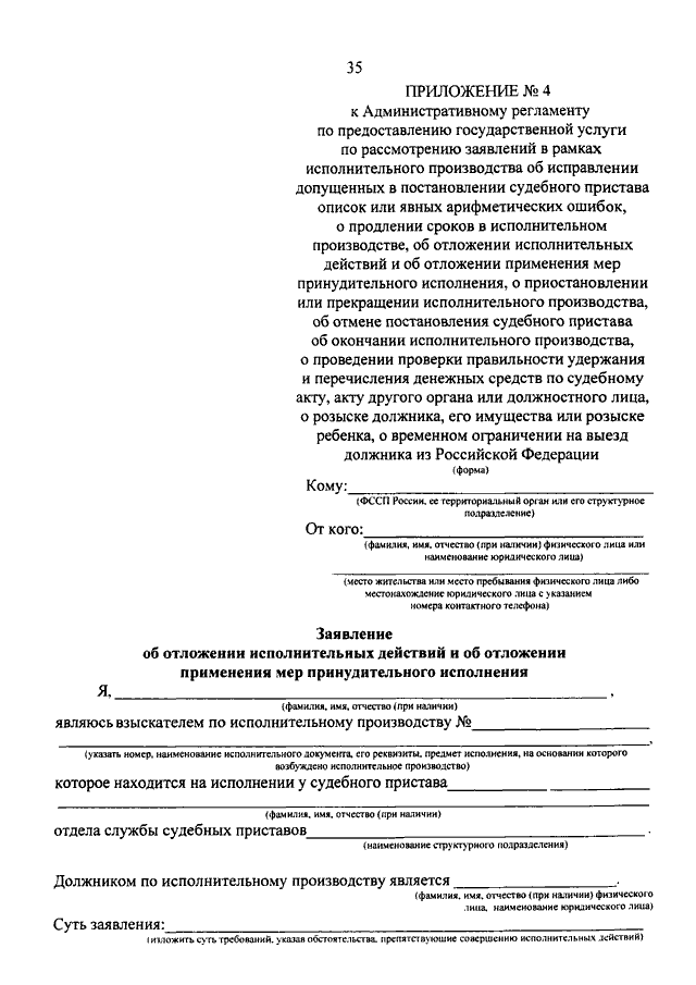 "ОБ УТВЕРЖДЕНИИ АДМИНИСТРАТИВНОГО РЕГЛАМЕНТА ФЕДЕРАЛЬНОЙ СЛУЖБЫ СУДЕБНЫХ ПРИСТАВОВ ПО ПРЕДОСТАВЛЕНИЮ ГОСУДАРСТВЕННОЙ УСЛУГИ ПО РАССМОТРЕНИЮ ЗАЯВЛЕНИЙ В РАМКАХ ИСПОЛНИТЕЛЬНОГО ПРОИЗВОДСТВА ОБ ИСПРАВЛЕНИИ ДОПУЩЕННЫХ В ПОСТАНОВЛЕНИИ СУДЕБНОГО ПРИСТАВА ОПИСОК ИЛИ ЯВНЫХ АРИФМЕТИЧЕСКИХ ОШИБОК, О ПРОДЛЕНИИ СРОКОВ В ИСПОЛНИТЕЛЬНОМ ПРОИЗВОДСТВЕ, ОБ ОТЛОЖЕНИИ ИСПОЛНИТЕЛЬНЫХ ДЕЙСТВИЙ И ОБ ОТЛОЖЕНИИ ПРИМЕНЕНИЯ МЕР ПРИНУДИТЕЛЬНОГО ИСПОЛНЕНИЯ, О ПРИОСТАНОВЛЕНИИ ИЛИ ПРЕКРАЩЕНИИ ИСПОЛНИТЕЛЬНОГО ПРОИЗВОДСТВА, ОБ ОТМЕНЕ ПОСТАНОВЛЕНИЯ СУДЕБНОГО ПРИСТАВА ОБ ОКОНЧАНИИ ИСПОЛНИТЕЛЬНОГО ПРОИЗВОДСТВА, О ПРОВЕДЕНИИ ПРОВЕРКИ ПРАВИЛЬНОСТИ УДЕРЖАНИЯ И ПЕРЕЧИСЛЕНИЯ ДЕНЕЖНЫХ СРЕДСТВ ПО СУДЕБНОМУ АКТУ, АКТУ ДРУГОГО ОРГАНА ИЛИ ДОЛЖНОСТНОГО ЛИЦА, О РОЗЫСКЕ ДОЛЖНИКА, ЕГО ИМУЩЕСТВА ИЛИ РОЗЫСКЕ РЕБЕНКА, О ВРЕМЕННОМ ОГРАНИЧЕНИИ НА ВЫЕЗД ДОЛЖНИКА ИЗ РОССИЙСКОЙ ФЕДЕРАЦИИ"
