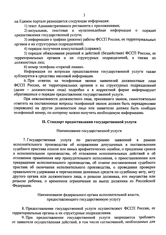 "ОБ УТВЕРЖДЕНИИ АДМИНИСТРАТИВНОГО РЕГЛАМЕНТА ФЕДЕРАЛЬНОЙ СЛУЖБЫ СУДЕБНЫХ ПРИСТАВОВ ПО ПРЕДОСТАВЛЕНИЮ ГОСУДАРСТВЕННОЙ УСЛУГИ ПО РАССМОТРЕНИЮ ЗАЯВЛЕНИЙ В РАМКАХ ИСПОЛНИТЕЛЬНОГО ПРОИЗВОДСТВА ОБ ИСПРАВЛЕНИИ ДОПУЩЕННЫХ В ПОСТАНОВЛЕНИИ СУДЕБНОГО ПРИСТАВА ОПИСОК ИЛИ ЯВНЫХ АРИФМЕТИЧЕСКИХ ОШИБОК, О ПРОДЛЕНИИ СРОКОВ В ИСПОЛНИТЕЛЬНОМ ПРОИЗВОДСТВЕ, ОБ ОТЛОЖЕНИИ ИСПОЛНИТЕЛЬНЫХ ДЕЙСТВИЙ И ОБ ОТЛОЖЕНИИ ПРИМЕНЕНИЯ МЕР ПРИНУДИТЕЛЬНОГО ИСПОЛНЕНИЯ, О ПРИОСТАНОВЛЕНИИ ИЛИ ПРЕКРАЩЕНИИ ИСПОЛНИТЕЛЬНОГО ПРОИЗВОДСТВА, ОБ ОТМЕНЕ ПОСТАНОВЛЕНИЯ СУДЕБНОГО ПРИСТАВА ОБ ОКОНЧАНИИ ИСПОЛНИТЕЛЬНОГО ПРОИЗВОДСТВА, О ПРОВЕДЕНИИ ПРОВЕРКИ ПРАВИЛЬНОСТИ УДЕРЖАНИЯ И ПЕРЕЧИСЛЕНИЯ ДЕНЕЖНЫХ СРЕДСТВ ПО СУДЕБНОМУ АКТУ, АКТУ ДРУГОГО ОРГАНА ИЛИ ДОЛЖНОСТНОГО ЛИЦА, О РОЗЫСКЕ ДОЛЖНИКА, ЕГО ИМУЩЕСТВА ИЛИ РОЗЫСКЕ РЕБЕНКА, О ВРЕМЕННОМ ОГРАНИЧЕНИИ НА ВЫЕЗД ДОЛЖНИКА ИЗ РОССИЙСКОЙ ФЕДЕРАЦИИ"