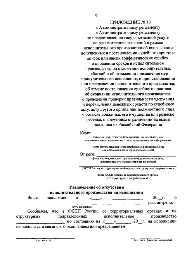 "ОБ УТВЕРЖДЕНИИ АДМИНИСТРАТИВНОГО РЕГЛАМЕНТА ФЕДЕРАЛЬНОЙ СЛУЖБЫ СУДЕБНЫХ ПРИСТАВОВ ПО ПРЕДОСТАВЛЕНИЮ ГОСУДАРСТВЕННОЙ УСЛУГИ ПО РАССМОТРЕНИЮ ЗАЯВЛЕНИЙ В РАМКАХ ИСПОЛНИТЕЛЬНОГО ПРОИЗВОДСТВА ОБ ИСПРАВЛЕНИИ ДОПУЩЕННЫХ В ПОСТАНОВЛЕНИИ СУДЕБНОГО ПРИСТАВА ОПИСОК ИЛИ ЯВНЫХ АРИФМЕТИЧЕСКИХ ОШИБОК, О ПРОДЛЕНИИ СРОКОВ В ИСПОЛНИТЕЛЬНОМ ПРОИЗВОДСТВЕ, ОБ ОТЛОЖЕНИИ ИСПОЛНИТЕЛЬНЫХ ДЕЙСТВИЙ И ОБ ОТЛОЖЕНИИ ПРИМЕНЕНИЯ МЕР ПРИНУДИТЕЛЬНОГО ИСПОЛНЕНИЯ, О ПРИОСТАНОВЛЕНИИ ИЛИ ПРЕКРАЩЕНИИ ИСПОЛНИТЕЛЬНОГО ПРОИЗВОДСТВА, ОБ ОТМЕНЕ ПОСТАНОВЛЕНИЯ СУДЕБНОГО ПРИСТАВА ОБ ОКОНЧАНИИ ИСПОЛНИТЕЛЬНОГО ПРОИЗВОДСТВА, О ПРОВЕДЕНИИ ПРОВЕРКИ ПРАВИЛЬНОСТИ УДЕРЖАНИЯ И ПЕРЕЧИСЛЕНИЯ ДЕНЕЖНЫХ СРЕДСТВ ПО СУДЕБНОМУ АКТУ, АКТУ ДРУГОГО ОРГАНА ИЛИ ДОЛЖНОСТНОГО ЛИЦА, О РОЗЫСКЕ ДОЛЖНИКА, ЕГО ИМУЩЕСТВА ИЛИ РОЗЫСКЕ РЕБЕНКА, О ВРЕМЕННОМ ОГРАНИЧЕНИИ НА ВЫЕЗД ДОЛЖНИКА ИЗ РОССИЙСКОЙ ФЕДЕРАЦИИ"