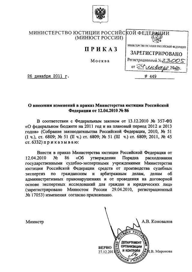 ПРИКАЗ Минюста РФ от 26.12.2011 N 449