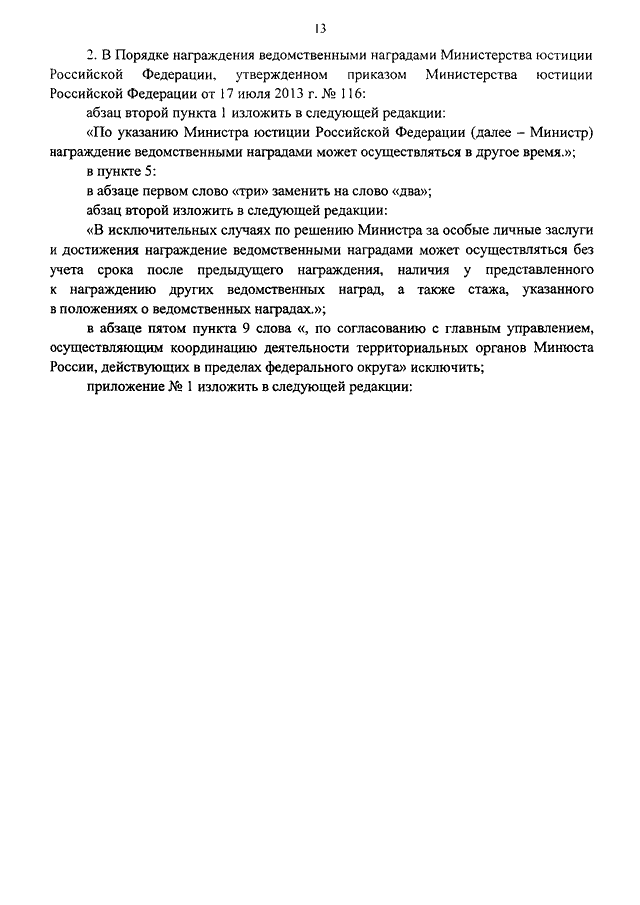"О ВНЕСЕНИИ ИЗМЕНЕНИЙ В ПРИКАЗ МИНЮСТА РОССИИ ОТ 17 ИЮЛЯ 2013 Г. N 116 "О ВЕДОМСТВЕННЫХ НАГРАДАХ МИНИСТЕРСТВА ЮСТИЦИИ РОССИЙСКОЙ ФЕДЕРАЦИИ"