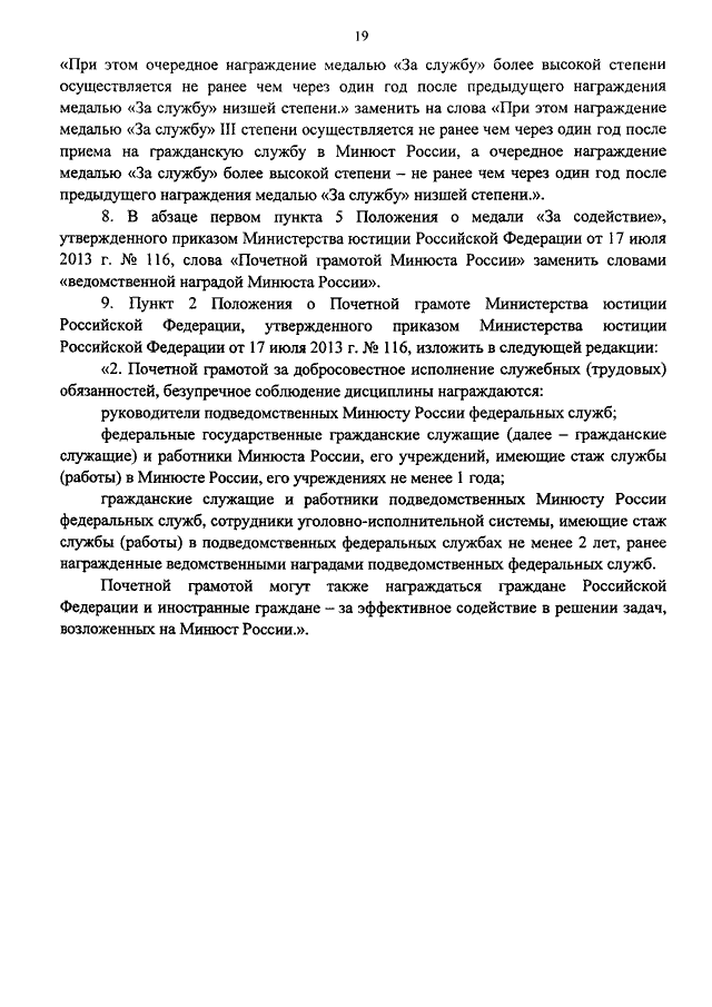 "О ВНЕСЕНИИ ИЗМЕНЕНИЙ В ПРИКАЗ МИНЮСТА РОССИИ ОТ 17 ИЮЛЯ 2013 Г. N 116 "О ВЕДОМСТВЕННЫХ НАГРАДАХ МИНИСТЕРСТВА ЮСТИЦИИ РОССИЙСКОЙ ФЕДЕРАЦИИ"