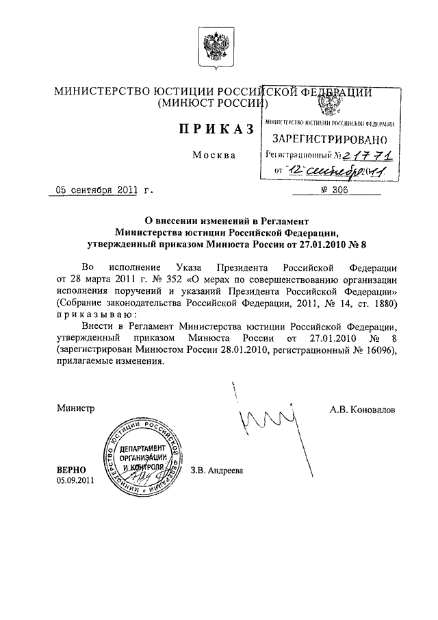 ПРИКАЗ Минюста РФ от 05.09.2011 N 306
