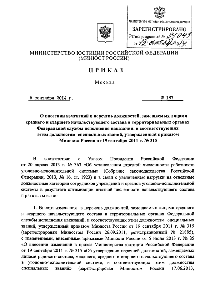 ПРИКАЗ Минюста РФ от 05.09.2014 N 187