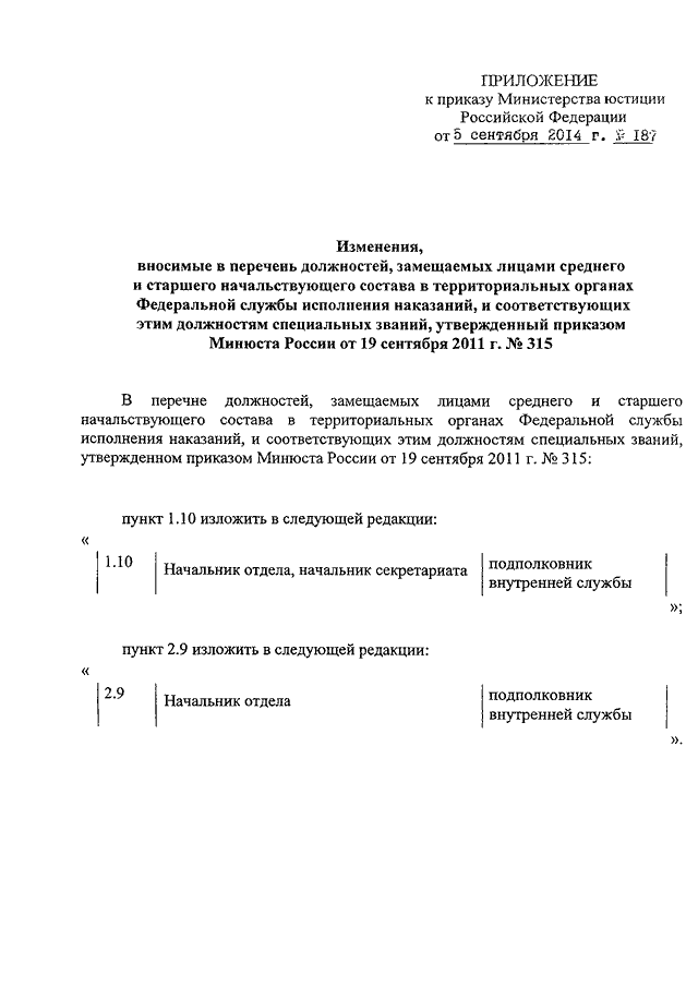 "О ВНЕСЕНИИ ИЗМЕНЕНИЙ В ПЕРЕЧЕНЬ ДОЛЖНОСТЕЙ, ЗАМЕЩАЕМЫХ ЛИЦАМИ СРЕДНЕГО И СТАРШЕГО НАЧАЛЬСТВУЮЩЕГО СОСТАВА В ТЕРРИТОРИАЛЬНЫХ ОРГАНАХ ФЕДЕРАЛЬНОЙ СЛУЖБЫ ИСПОЛНЕНИЯ НАКАЗАНИЙ, И СООТВЕТСТВУЮЩИХ ЭТИМ ДОЛЖНОСТЯМ СПЕЦИАЛЬНЫХ ЗВАНИЙ, УТВЕРЖДЕННЫЙ ПРИКАЗОМ МИНЮСТА РОССИИ ОТ 19 СЕНТЯБРЯ 2011 Г. N 315"