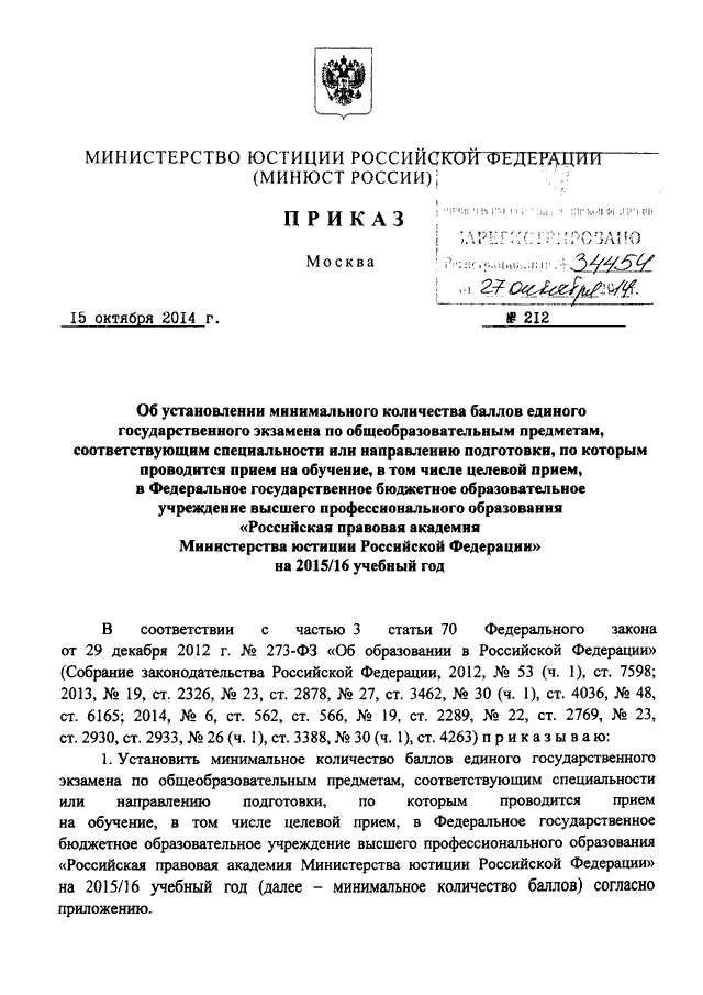 ПРИКАЗ Минюста РФ от 15.10.2014 N 212
