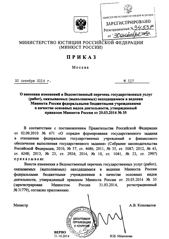 ПРИКАЗ Минюста РФ от 20.10.2014 N 217