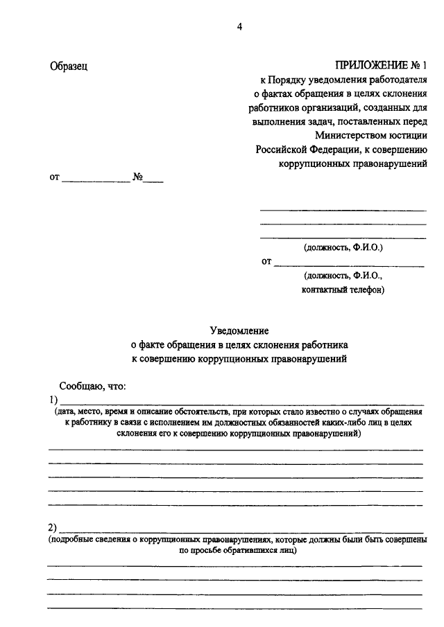 "ОБ УТВЕРЖДЕНИИ ПОРЯДКА УВЕДОМЛЕНИЯ РАБОТОДАТЕЛЯ О ФАКТАХ ОБРАЩЕНИЯ В ЦЕЛЯХ СКЛОНЕНИЯ РАБОТНИКОВ ОРГАНИЗАЦИЙ, СОЗДАННЫХ ДЛЯ ВЫПОЛНЕНИЯ ЗАДАЧ, ПОСТАВЛЕННЫХ ПЕРЕД МИНИСТЕРСТВОМ ЮСТИЦИИ РОССИЙСКОЙ ФЕДЕРАЦИИ, К СОВЕРШЕНИЮ КОРРУПЦИОННЫХ ПРАВОНАРУШЕНИЙ"
