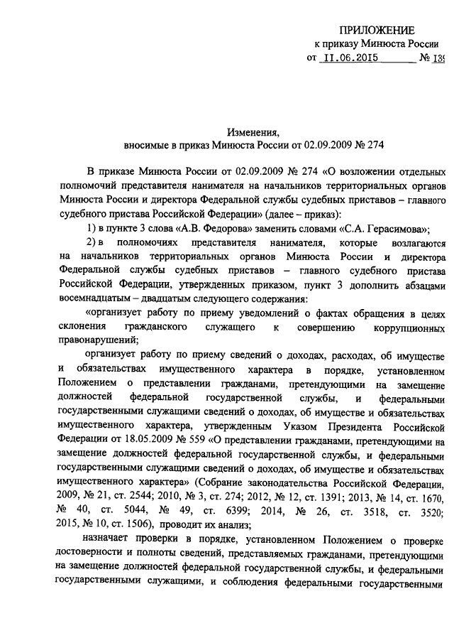 "О ВНЕСЕНИИ ИЗМЕНЕНИЙ В ПРИКАЗ МИНЮСТА РОССИИ ОТ 02.09.2009 N 274 "О ВОЗЛОЖЕНИИ ОТДЕЛЬНЫХ ПОЛНОМОЧИЙ ПРЕДСТАВИТЕЛЯ НАНИМАТЕЛЯ НА НАЧАЛЬНИКОВ ТЕРРИТОРИАЛЬНЫХ ОРГАНОВ МИНЮСТА РОССИИ И ДИРЕКТОРА ФЕДЕРАЛЬНОЙ СЛУЖБЫ СУДЕБНЫХ ПРИСТАВОВ - ГЛАВНОГО СУДЕБНОГО ПРИСТАВА РОССИЙСКОЙ ФЕДЕРАЦИИ"