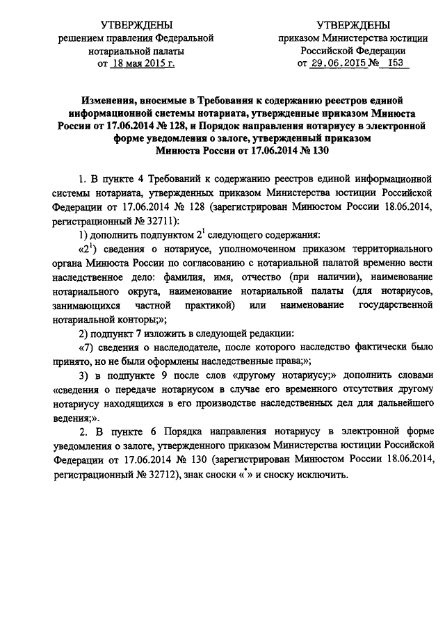 "О ВНЕСЕНИИ ИЗМЕНЕНИЙ В ТРЕБОВАНИЯ К СОДЕРЖАНИЮ РЕЕСТРОВ ЕДИНОЙ ИНФОРМАЦИОННОЙ СИСТЕМЫ НОТАРИАТА, УТВЕРЖДЕННЫЕ ПРИКАЗОМ МИНЮСТА РОССИИ ОТ 17.06.2014 N 128, И В ПОРЯДОК НАПРАВЛЕНИЯ НОТАРИУСУ В ЭЛЕКТРОННОЙ ФОРМЕ УВЕДОМЛЕНИЯ О ЗАЛОГЕ, УТВЕРЖДЕННЫЙ ПРИКАЗОМ МИНЮСТА РОССИИ ОТ 17.06.2014 N 130"