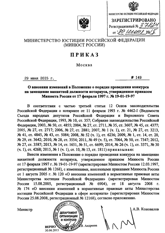 ПРИКАЗ Минюста РФ от 29.06.2015 N 149