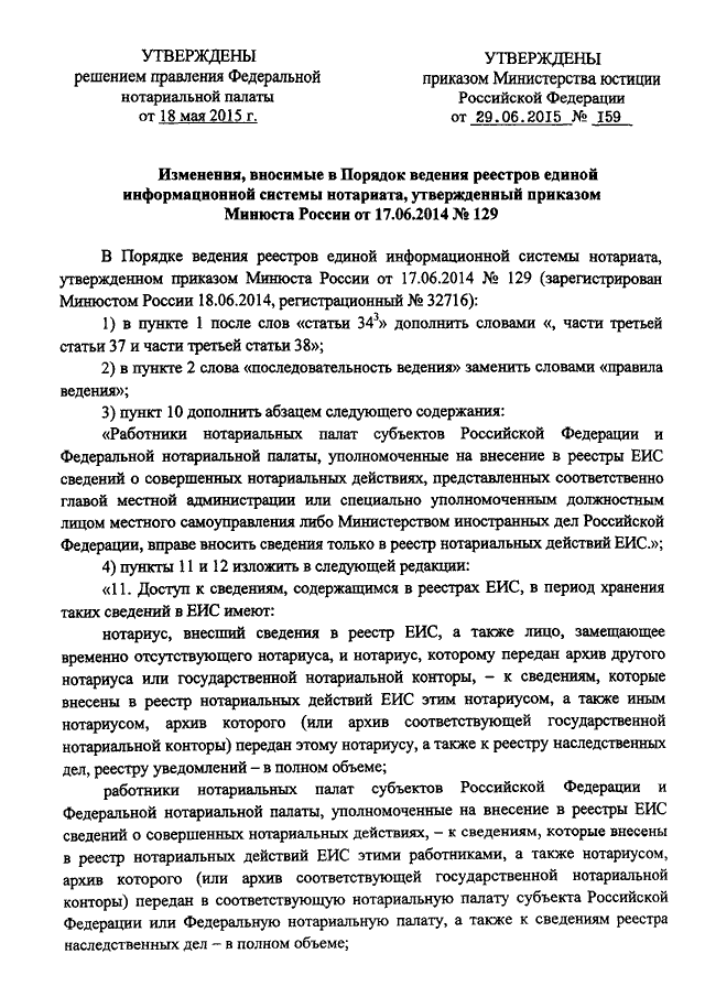 "О ВНЕСЕНИИ ИЗМЕНЕНИЙ В ПОРЯДОК ВЕДЕНИЯ РЕЕСТРОВ ЕДИНОЙ ИНФОРМАЦИОННОЙ СИСТЕМЫ НОТАРИАТА, УТВЕРЖДЕННЫЙ ПРИКАЗОМ МИНЮСТА РОССИИ ОТ 17.06.2014 N 129"