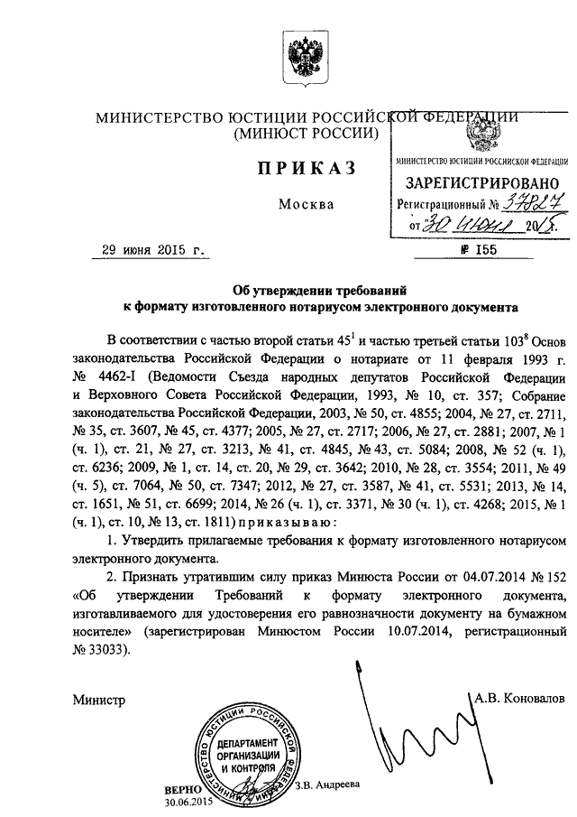 ПРИКАЗ Минюста РФ от 29.06.2015 N 155