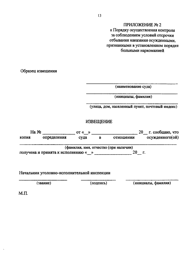"ОБ УТВЕРЖДЕНИИ ПОРЯДКА ОСУЩЕСТВЛЕНИЯ КОНТРОЛЯ ЗА СОБЛЮДЕНИЕМ УСЛОВИЙ ОТСРОЧКИ ОТБЫВАНИЯ НАКАЗАНИЯ ОСУЖДЕННЫМИ, ПРИЗНАННЫМИ В УСТАНОВЛЕННОМ ПОРЯДКЕ БОЛЬНЫМИ НАРКОМАНИЕЙ"