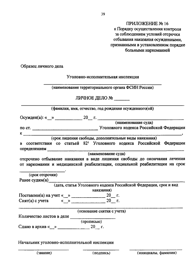 "ОБ УТВЕРЖДЕНИИ ПОРЯДКА ОСУЩЕСТВЛЕНИЯ КОНТРОЛЯ ЗА СОБЛЮДЕНИЕМ УСЛОВИЙ ОТСРОЧКИ ОТБЫВАНИЯ НАКАЗАНИЯ ОСУЖДЕННЫМИ, ПРИЗНАННЫМИ В УСТАНОВЛЕННОМ ПОРЯДКЕ БОЛЬНЫМИ НАРКОМАНИЕЙ"