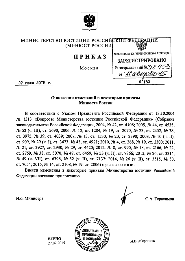 ПРИКАЗ Минюста РФ от 27.07.2015 N 183