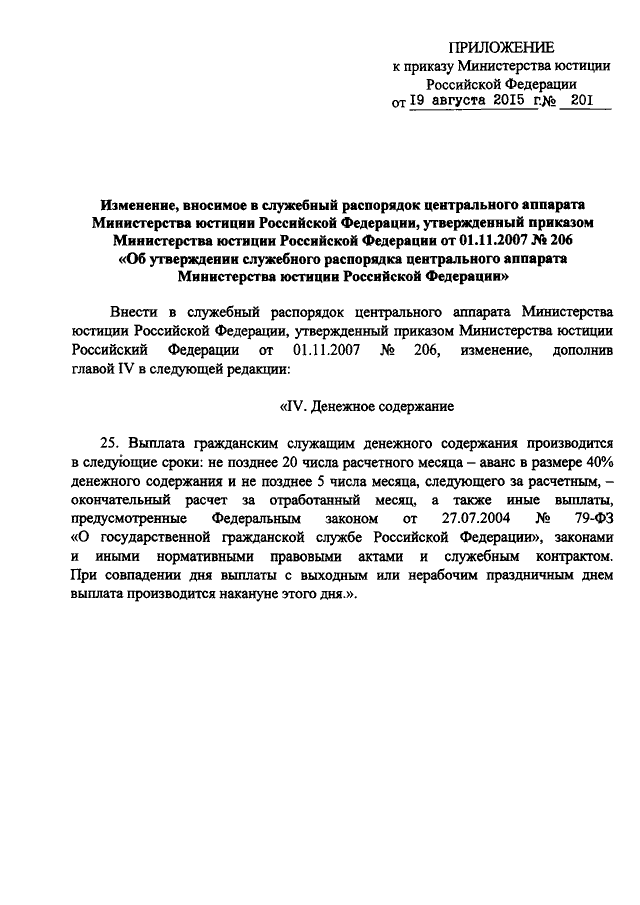 "О ВНЕСЕНИИ ИЗМЕНЕНИЯ В СЛУЖЕБНЫЙ РАСПОРЯДОК ЦЕНТРАЛЬНОГО АППАРАТА МИНИСТЕРСТВА ЮСТИЦИИ РОССИЙСКОЙ ФЕДЕРАЦИИ, УТВЕРЖДЕННЫЙ ПРИКАЗОМ МИНИСТЕРСТВА ЮСТИЦИИ РОССИЙСКОЙ ФЕДЕРАЦИИ ОТ 01.11.2007 N 206 "ОБ УТВЕРЖДЕНИИ СЛУЖЕБНОГО РАСПОРЯДКА ЦЕНТРАЛЬНОГО АППАРАТА МИНИСТЕРСТВА ЮСТИЦИИ РОССИЙСКОЙ ФЕДЕРАЦИИ"