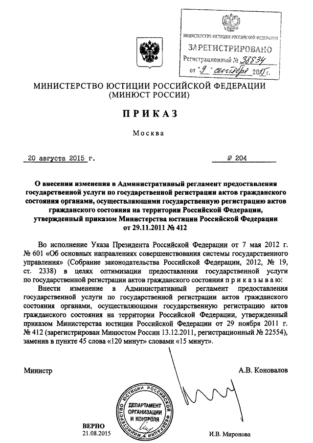 ПРИКАЗ Минюста РФ от 20.08.2015 N 204