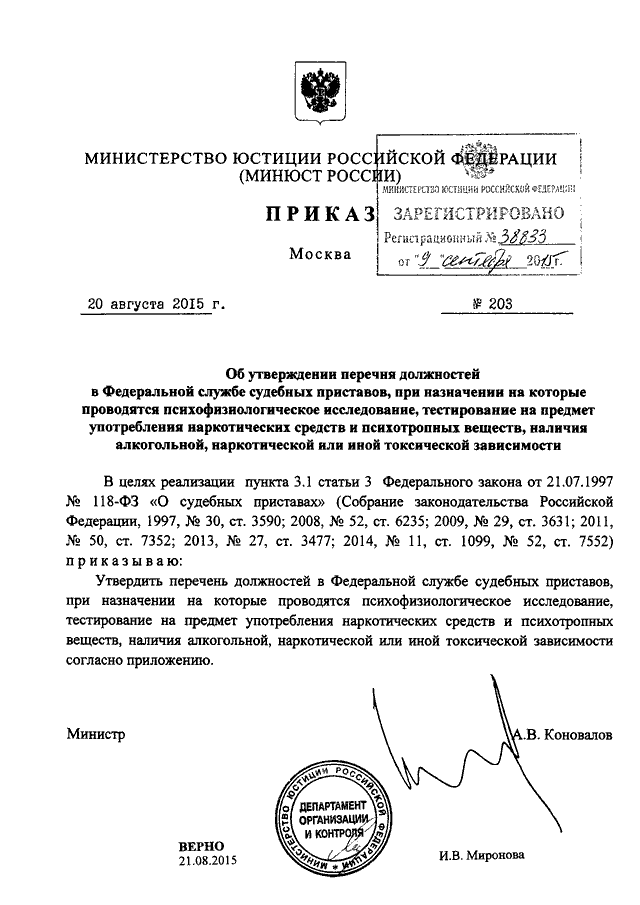 ПРИКАЗ Минюста РФ от 20.08.2015 N 203