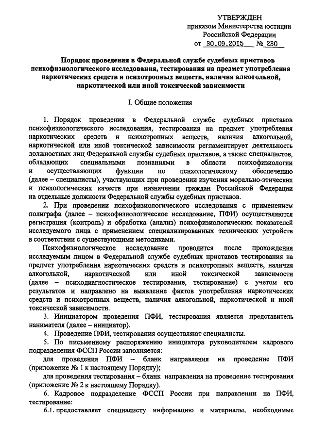 "ОБ УТВЕРЖДЕНИИ ПОРЯДКА ПРОВЕДЕНИЯ В ФЕДЕРАЛЬНОЙ СЛУЖБЕ СУДЕБНЫХ ПРИСТАВОВ ПСИХОФИЗИОЛОГИЧЕСКОГО ИССЛЕДОВАНИЯ, ТЕСТИРОВАНИЯ НА ПРЕДМЕТ УПОТРЕБЛЕНИЯ НАРКОТИЧЕСКИХ СРЕДСТВ И ПСИХОТРОПНЫХ ВЕЩЕСТВ, НАЛИЧИЯ АЛКОГОЛЬНОЙ, НАРКОТИЧЕСКОЙ ИЛИ ИНОЙ ТОКСИЧЕСКОЙ ЗАВИСИМОСТИ"