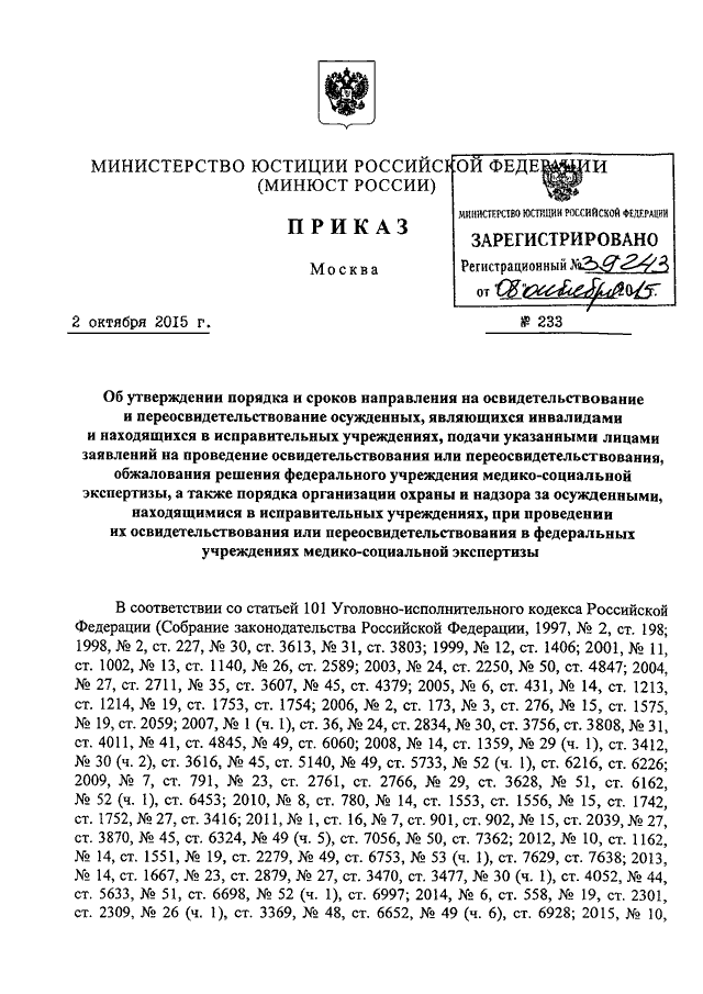 ПРИКАЗ Минюста РФ от 02.10.2015 N 233