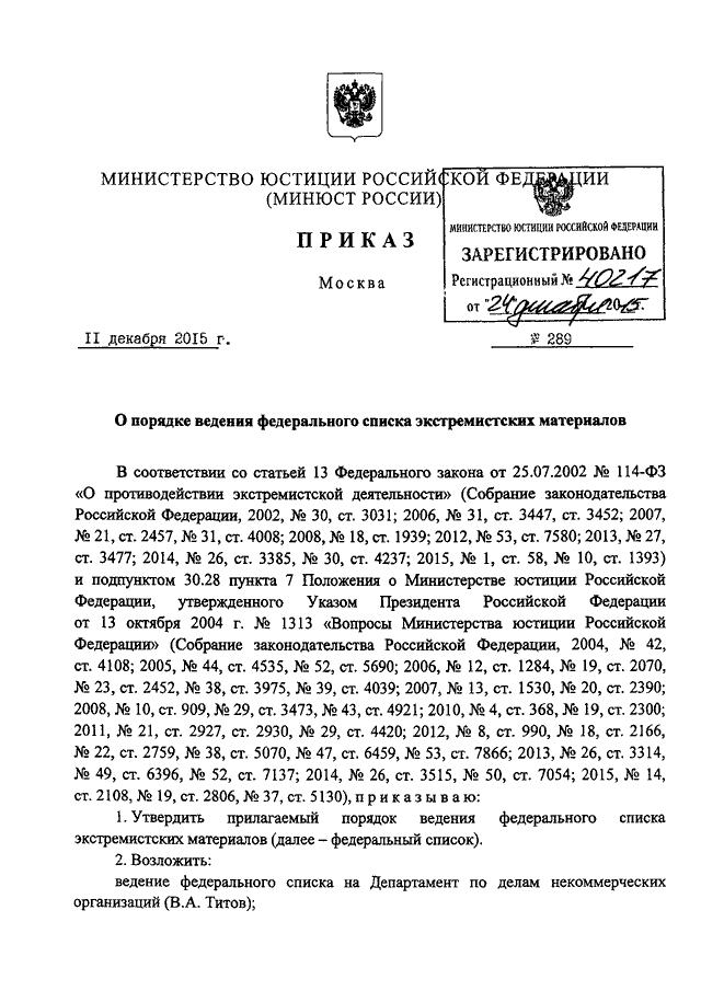ПРИКАЗ Минюста РФ от 11.12.2015 N 289