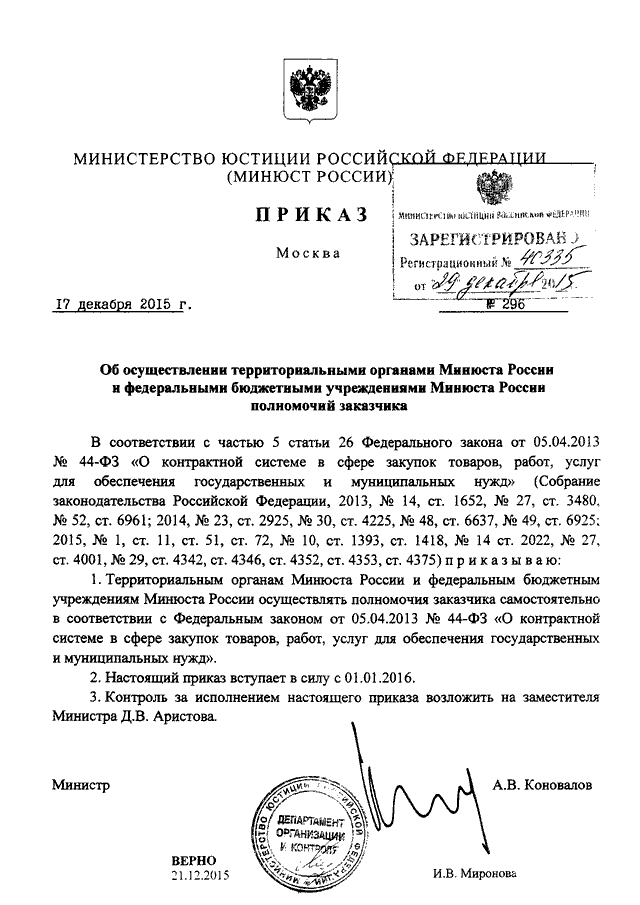 ПРИКАЗ Минюста РФ от 17.12.2015 N 296