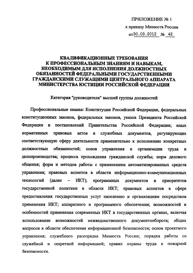 (вместе с "КВАЛИФИКАЦИОННЫМИ ТРЕБОВАНИЯМИ К ПРОФЕССИОНАЛЬНЫМ ЗНАНИЯМ И НАВЫКАМ В ОБЛАСТИ ИНФОРМАЦИОННО - КОММУНИКАЦИОННЫХ ТЕХНОЛОГИЙ, НЕОБХОДИМЫМ ДЛЯ ИСПОЛНЕНИЯ ДОЛЖНОСТНЫХ ОБЯЗАННОСТЕЙ ФЕДЕРАЛЬНЫМИ ГОСУДАРСТВЕННЫМИ ГРАЖДАНСКИМИ СЛУЖАЩИМИ ЦЕНТРАЛЬНОГО АППАРАТА МИНИСТЕРСТВА ЮСТИЦИИ РОССИЙСКОЙ ФЕДЕРАЦИИ, КУРИРУЮЩИМИ ВОПРОСЫ ВНЕДРЕНИЯ ИНФОРМАЦИОННО - КОММУНИКАЦИОННЫХ ТЕХНОЛОГИЙ В ДЕЯТЕЛЬНОСТЬ МИНЮСТА РОССИИ, А ТАКЖЕ В ЧЬИ ДОЛЖНОСТНЫЕ ОБЯЗАННОСТИ ВХОДЯТ СОЗДАНИЕ, РАЗВИТИЕ И АДМИНИСТРИРОВАНИЕ ИНФОРМАЦИОННЫХ СИСТЕМ") (Зарегистрировано в Минюсте РФ 09.04.2012 N 23769)