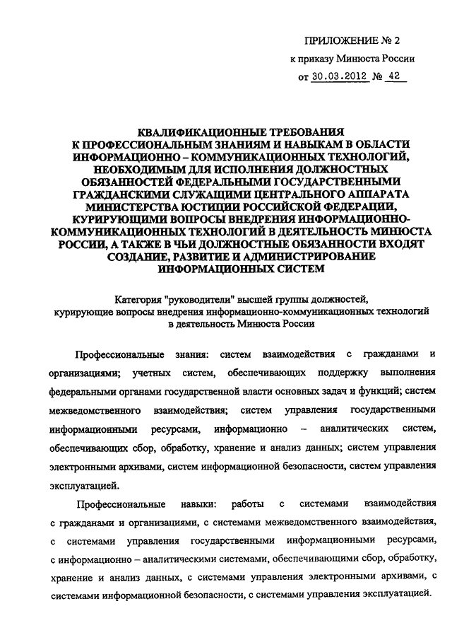 (вместе с "КВАЛИФИКАЦИОННЫМИ ТРЕБОВАНИЯМИ К ПРОФЕССИОНАЛЬНЫМ ЗНАНИЯМ И НАВЫКАМ В ОБЛАСТИ ИНФОРМАЦИОННО - КОММУНИКАЦИОННЫХ ТЕХНОЛОГИЙ, НЕОБХОДИМЫМ ДЛЯ ИСПОЛНЕНИЯ ДОЛЖНОСТНЫХ ОБЯЗАННОСТЕЙ ФЕДЕРАЛЬНЫМИ ГОСУДАРСТВЕННЫМИ ГРАЖДАНСКИМИ СЛУЖАЩИМИ ЦЕНТРАЛЬНОГО АППАРАТА МИНИСТЕРСТВА ЮСТИЦИИ РОССИЙСКОЙ ФЕДЕРАЦИИ, КУРИРУЮЩИМИ ВОПРОСЫ ВНЕДРЕНИЯ ИНФОРМАЦИОННО - КОММУНИКАЦИОННЫХ ТЕХНОЛОГИЙ В ДЕЯТЕЛЬНОСТЬ МИНЮСТА РОССИИ, А ТАКЖЕ В ЧЬИ ДОЛЖНОСТНЫЕ ОБЯЗАННОСТИ ВХОДЯТ СОЗДАНИЕ, РАЗВИТИЕ И АДМИНИСТРИРОВАНИЕ ИНФОРМАЦИОННЫХ СИСТЕМ") (Зарегистрировано в Минюсте РФ 09.04.2012 N 23769)