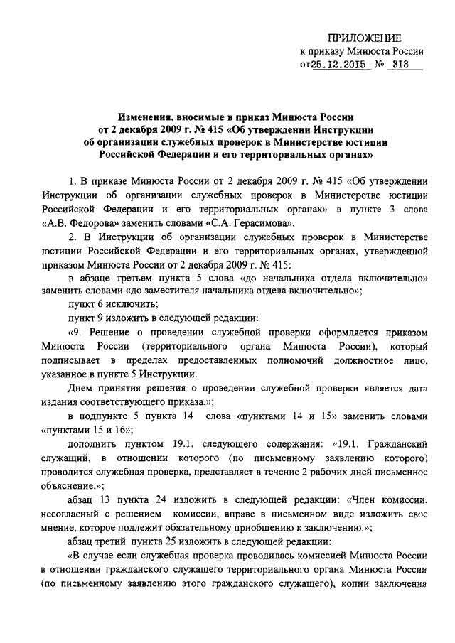 "О ВНЕСЕНИИ ИЗМЕНЕНИЙ В ПРИКАЗ МИНЮСТА РОССИИ ОТ 2 ДЕКАБРЯ 2009 Г. N 415 "ОБ УТВЕРЖДЕНИИ ИНСТРУКЦИИ ОБ ОРГАНИЗАЦИИ СЛУЖЕБНЫХ ПРОВЕРОК В МИНИСТЕРСТВЕ ЮСТИЦИИ РОССИЙСКОЙ ФЕДЕРАЦИИ И ЕГО ТЕРРИТОРИАЛЬНЫХ ОРГАНАХ"