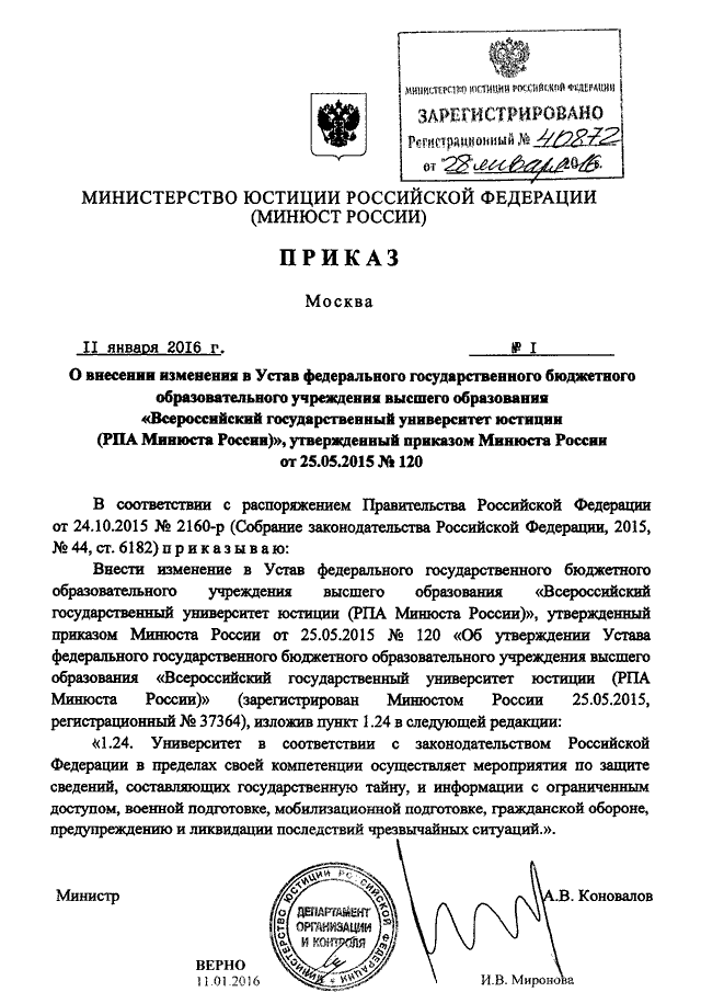 ПРИКАЗ Минюста РФ от 11.01.2016 N 1