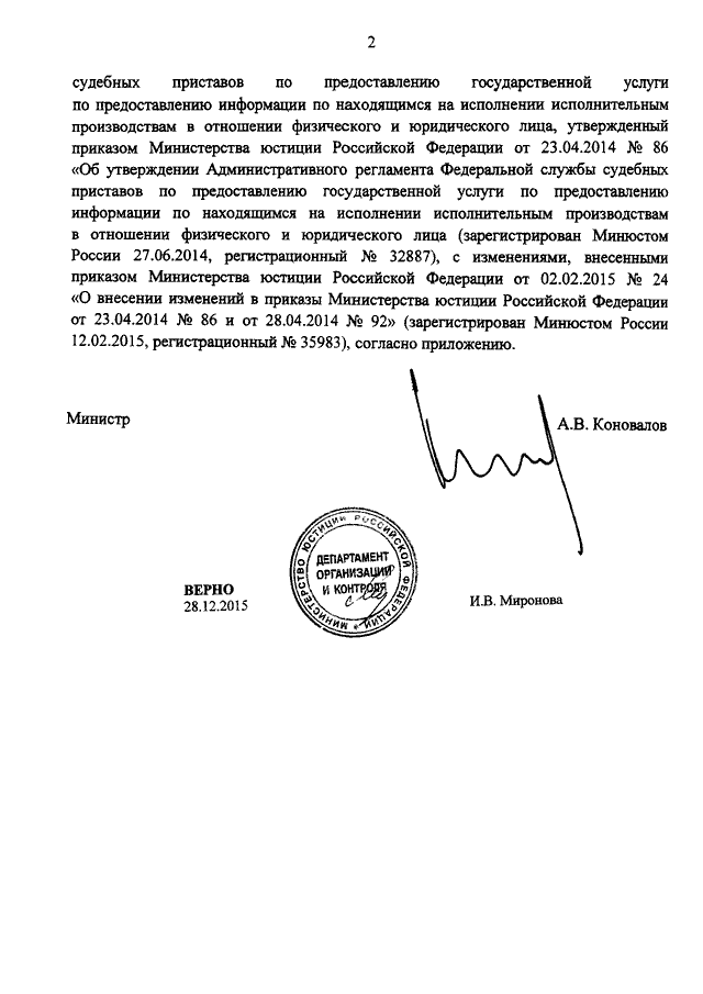 "О ВНЕСЕНИИ ИЗМЕНЕНИЙ В АДМИНИСТРАТИВНЫЙ РЕГЛАМЕНТ ФЕДЕРАЛЬНОЙ СЛУЖБЫ СУДЕБНЫХ ПРИСТАВОВ ПО ПРЕДОСТАВЛЕНИЮ ГОСУДАРСТВЕННОЙ УСЛУГИ ПО ПРЕДОСТАВЛЕНИЮ ИНФОРМАЦИИ ПО НАХОДЯЩИМСЯ НА ИСПОЛНЕНИИ ИСПОЛНИТЕЛЬНЫМ ПРОИЗВОДСТВАМ В ОТНОШЕНИИ ФИЗИЧЕСКОГО И ЮРИДИЧЕСКОГО ЛИЦА, УТВЕРЖДЕННЫЙ ПРИКАЗОМ МИНИСТЕРСТВА ЮСТИЦИИ РОССИЙСКОЙ ФЕДЕРАЦИИ ОТ 23.04.2014 N 86"