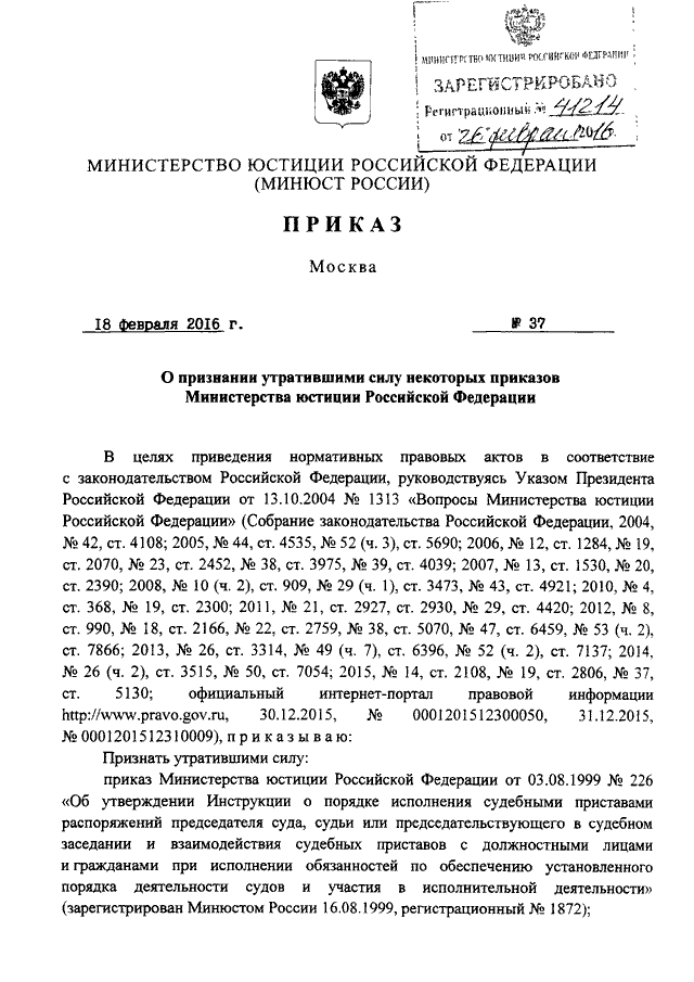 ПРИКАЗ Минюста РФ от 18.02.2016 N 37