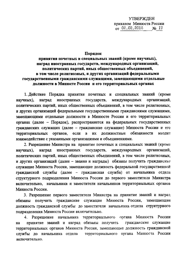 ПРИКАЗ Минюста РФ от 02.02.2016 N 19