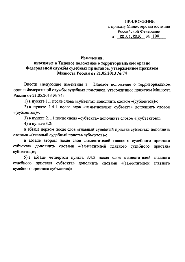 "О ВНЕСЕНИИ ИЗМЕНЕНИЙ В ТИПОВОЕ ПОЛОЖЕНИЕ О ТЕРРИТОРИАЛЬНОМ ОРГАНЕ ФЕДЕРАЛЬНОЙ СЛУЖБЫ СУДЕБНЫХ ПРИСТАВОВ, УТВЕРЖДЕННОЕ ПРИКАЗОМ МИНЮСТА РОССИИ ОТ 21.05.2013 N 74"