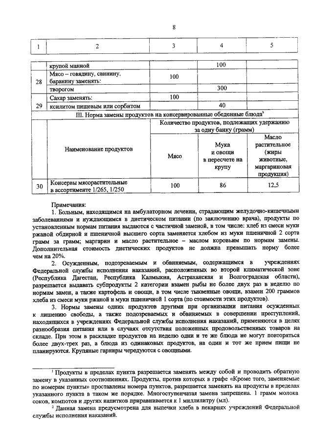 "ОБ УСТАНОВЛЕНИИ ПОВЫШЕННЫХ НОРМ ПИТАНИЯ, РАЦИОНА ПИТАНИЯ И НОРМ ЗАМЕНЫ ОДНИХ ПРОДУКТОВ ПИТАНИЯ ДРУГИМИ, ПРИМЕНЯЕМЫХ ПРИ ОРГАНИЗАЦИИ ПИТАНИЯ ОСУЖДЕННЫХ К ЛИШЕНИЮ СВОБОДЫ, А ТАКЖЕ ПОДОЗРЕВАЕМЫХ И ОБВИНЯЕМЫХ В СОВЕРШЕНИИ ПРЕСТУПЛЕНИЙ, НАХОДЯЩИХСЯ В УЧРЕЖДЕНИЯХ ФЕДЕРАЛЬНОЙ СЛУЖБЫ ИСПОЛНЕНИЯ НАКАЗАНИЙ, НА МИРНОЕ ВРЕМЯ"