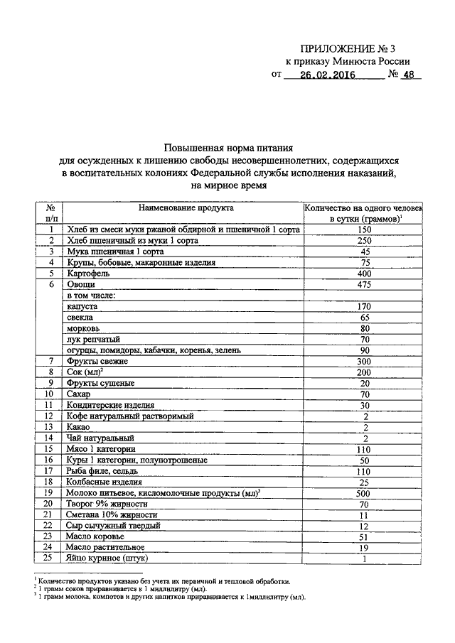 "ОБ УСТАНОВЛЕНИИ ПОВЫШЕННЫХ НОРМ ПИТАНИЯ, РАЦИОНА ПИТАНИЯ И НОРМ ЗАМЕНЫ ОДНИХ ПРОДУКТОВ ПИТАНИЯ ДРУГИМИ, ПРИМЕНЯЕМЫХ ПРИ ОРГАНИЗАЦИИ ПИТАНИЯ ОСУЖДЕННЫХ К ЛИШЕНИЮ СВОБОДЫ, А ТАКЖЕ ПОДОЗРЕВАЕМЫХ И ОБВИНЯЕМЫХ В СОВЕРШЕНИИ ПРЕСТУПЛЕНИЙ, НАХОДЯЩИХСЯ В УЧРЕЖДЕНИЯХ ФЕДЕРАЛЬНОЙ СЛУЖБЫ ИСПОЛНЕНИЯ НАКАЗАНИЙ, НА МИРНОЕ ВРЕМЯ"