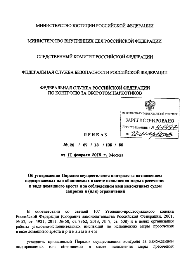 ПРИКАЗ Минюста РФ N 26, МВД РФ N 67, Следственного комитета РФ N 13, ФСБ РФ N 105, ФСКН РФ N 56 от 11.02.2016
