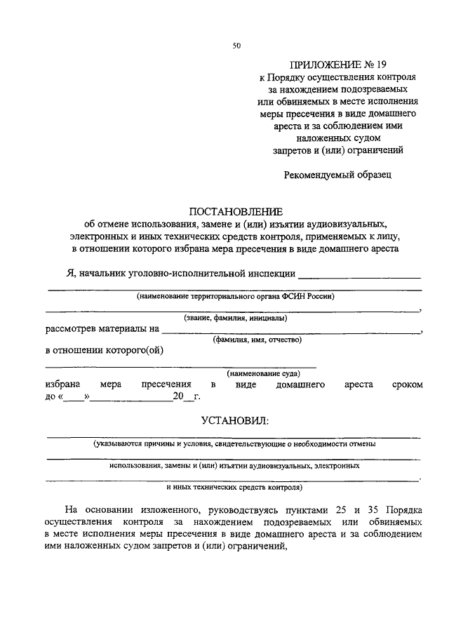 "ОБ УТВЕРЖДЕНИИ ПОРЯДКА ОСУЩЕСТВЛЕНИЯ КОНТРОЛЯ ЗА НАХОЖДЕНИЕМ ПОДОЗРЕВАЕМЫХ ИЛИ ОБВИНЯЕМЫХ В МЕСТЕ ИСПОЛНЕНИЯ МЕРЫ ПРЕСЕЧЕНИЯ В ВИДЕ ДОМАШНЕГО АРЕСТА И ЗА СОБЛЮДЕНИЕМ ИМИ НАЛОЖЕННЫХ СУДОМ ЗАПРЕТОВ И (ИЛИ) ОГРАНИЧЕНИЙ"