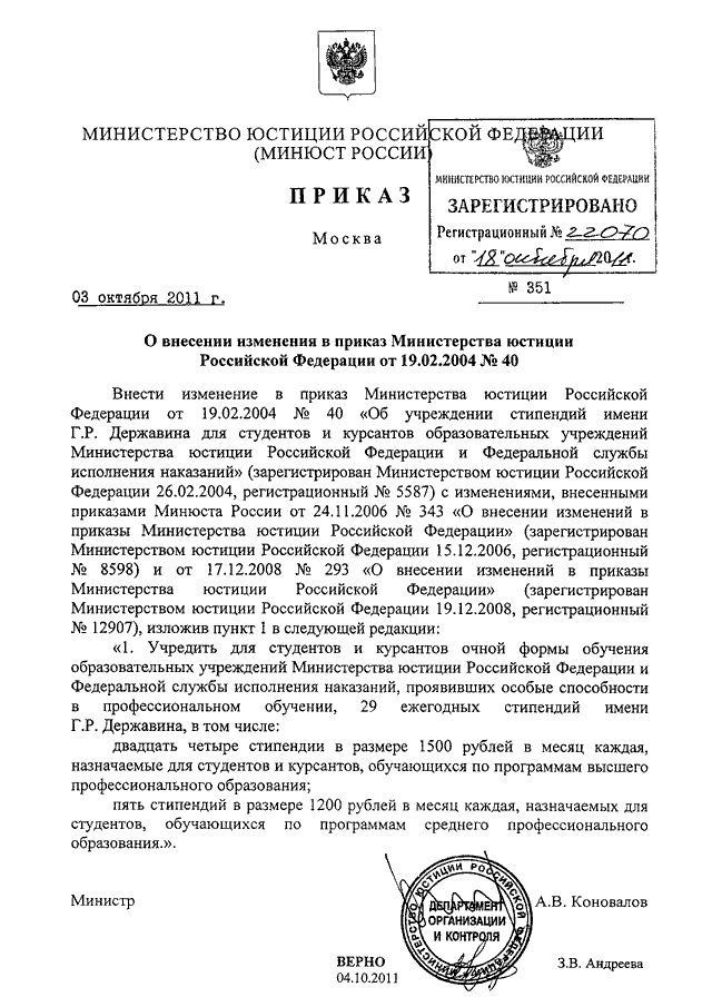 ПРИКАЗ Минюста РФ от 03.10.2011 N 351