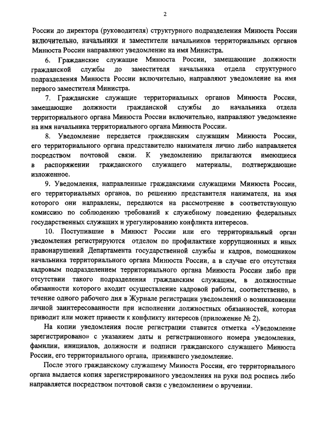 "ОБ УТВЕРЖДЕНИИ ПОРЯДКА УВЕДОМЛЕНИЯ ФЕДЕРАЛЬНЫМИ ГОСУДАРСТВЕННЫМИ ГРАЖДАНСКИМИ СЛУЖАЩИМИ МИНЮСТА РОССИИ И ЕГО ТЕРРИТОРИАЛЬНЫХ ОРГАНОВ О ВОЗНИКНОВЕНИИ ЛИЧНОЙ ЗАИНТЕРЕСОВАННОСТИ ПРИ ИСПОЛНЕНИИ ДОЛЖНОСТНЫХ ОБЯЗАННОСТЕЙ, КОТОРАЯ ПРИВОДИТ ИЛИ МОЖЕТ ПРИВЕСТИ К КОНФЛИКТУ ИНТЕРЕСОВ"
