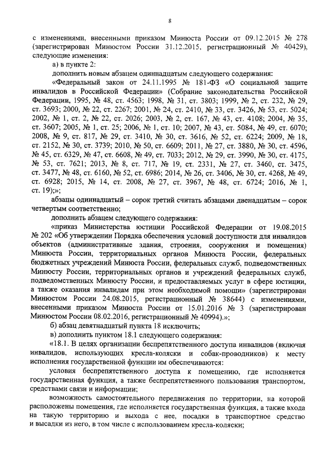 "О ВНЕСЕНИИ ИЗМЕНЕНИЙ В НЕКОТОРЫЕ ПРИКАЗЫ МИНИСТЕРСТВА ЮСТИЦИИ РОССИЙСКОЙ ФЕДЕРАЦИИ В ЧАСТИ ОБЕСПЕЧЕНИЯ УСЛОВИЙ ДОСТУПНОСТИ ДЛЯ ИНВАЛИДОВ ГОСУДАРСТВЕННЫХ УСЛУГ (ФУНКЦИЙ), ПРЕДОСТАВЛЯЕМЫХ (ИСПОЛНЯЕМЫХ) МИНИСТЕРСТВОМ ЮСТИЦИИ РОССИЙСКОЙ ФЕДЕРАЦИИ"
