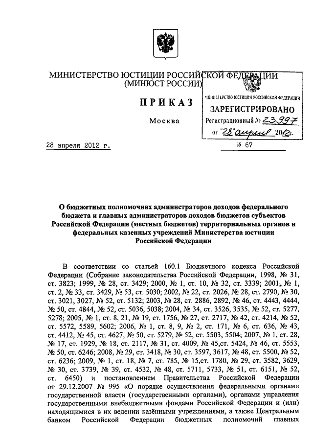 ПРИКАЗ Минюста РФ от 28.04.2012 N 67