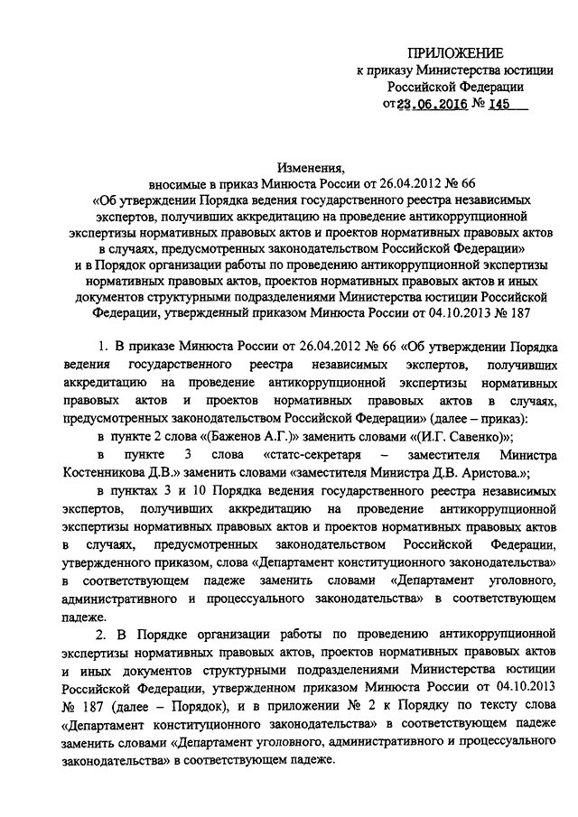 "О ВНЕСЕНИИ ИЗМЕНЕНИЙ В ПРИКАЗ МИНЮСТА РОССИИ ОТ 26.04.2012 N 66 "ОБ УТВЕРЖДЕНИИ ПОРЯДКА ВЕДЕНИЯ ГОСУДАРСТВЕННОГО РЕЕСТРА НЕЗАВИСИМЫХ ЭКСПЕРТОВ, ПОЛУЧИВШИХ АККРЕДИТАЦИЮ НА ПРОВЕДЕНИЕ АНТИКОРРУПЦИОННОЙ ЭКСПЕРТИЗЫ НОРМАТИВНЫХ ПРАВОВЫХ АКТОВ И ПРОЕКТОВ НОРМАТИВНЫХ ПРАВОВЫХ АКТОВ В СЛУЧАЯХ, ПРЕДУСМОТРЕННЫХ ЗАКОНОДАТЕЛЬСТВОМ РОССИЙСКОЙ ФЕДЕРАЦИИ" И В ПОРЯДОК ОРГАНИЗАЦИИ РАБОТЫ ПО ПРОВЕДЕНИЮ АНТИКОРРУПЦИОННОЙ ЭКСПЕРТИЗЫ НОРМАТИВНЫХ ПРАВОВЫХ АКТОВ, ПРОЕКТОВ НОРМАТИВНЫХ ПРАВОВЫХ АКТОВ И ИНЫХ ДОКУМЕНТОВ СТРУКТУРНЫМИ ПОДРАЗДЕЛЕНИЯМИ МИНИСТЕРСТВА ЮСТИЦИИ РОССИЙСКОЙ ФЕДЕРАЦИИ, УТВЕРЖДЕННЫЙ ПРИКАЗОМ МИНЮСТА РОССИИ ОТ 04.10.2013 N 187"
