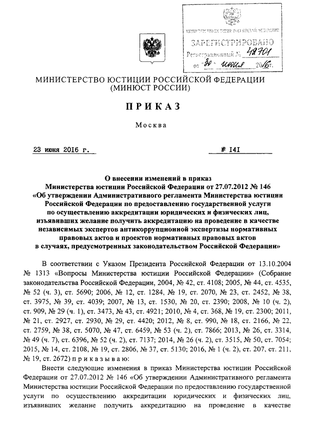 ПРИКАЗ Минюста РФ от 23.06.2016 N 141