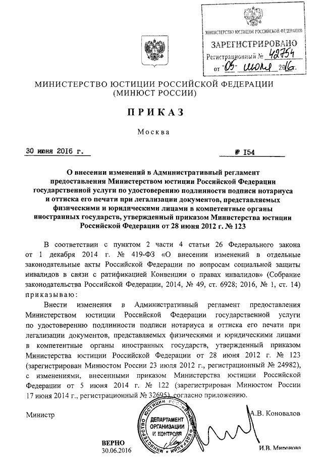 ПРИКАЗ Минюста РФ от 30.06.2016 N 154